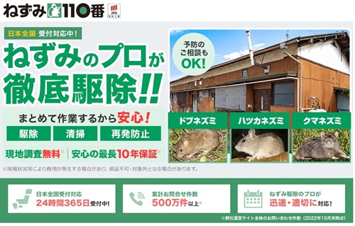 「ねずみ110番」は、累計問い合わせ件数500万件以上を誇る大手害獣駆除業者です。実績が豊富なため、個人宅から飲食店、大型施設まで日本全国のあらゆるネズミトラブルを解決できるのが大きな強みでしょう。