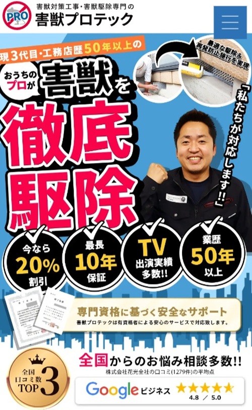 「害獣プロテック」は50年以上の業歴を持つプロの職人が対応してくれるのが魅力です。長年の建築経験を持つ職人が施工を担当することで、一般の駆除業者では見落としがちな複雑な侵入経路まで徹底的に特定・封鎖することが可能です。